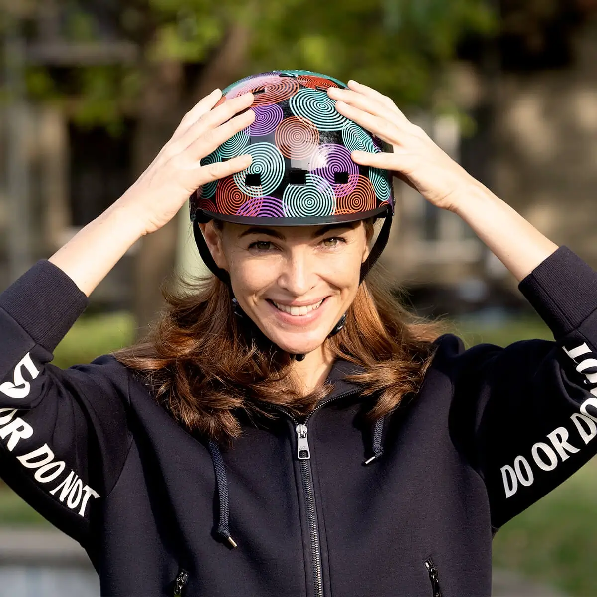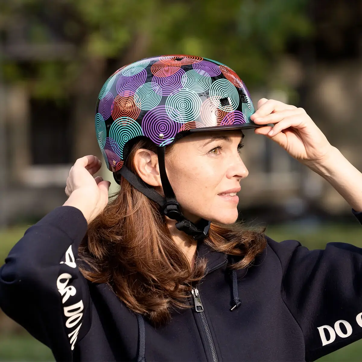 Réglage de la calotte: Le casque urbain s’adapte parfaitement à la forme de la tête grâce à son système de réglage pratique et rapide. En tournant la molette située à l’arrière du casque, un dispositif de réglage situé à l’intérieur du casque se dilate et se contracte pour s’adapter parfaitement à la forme de la tête.